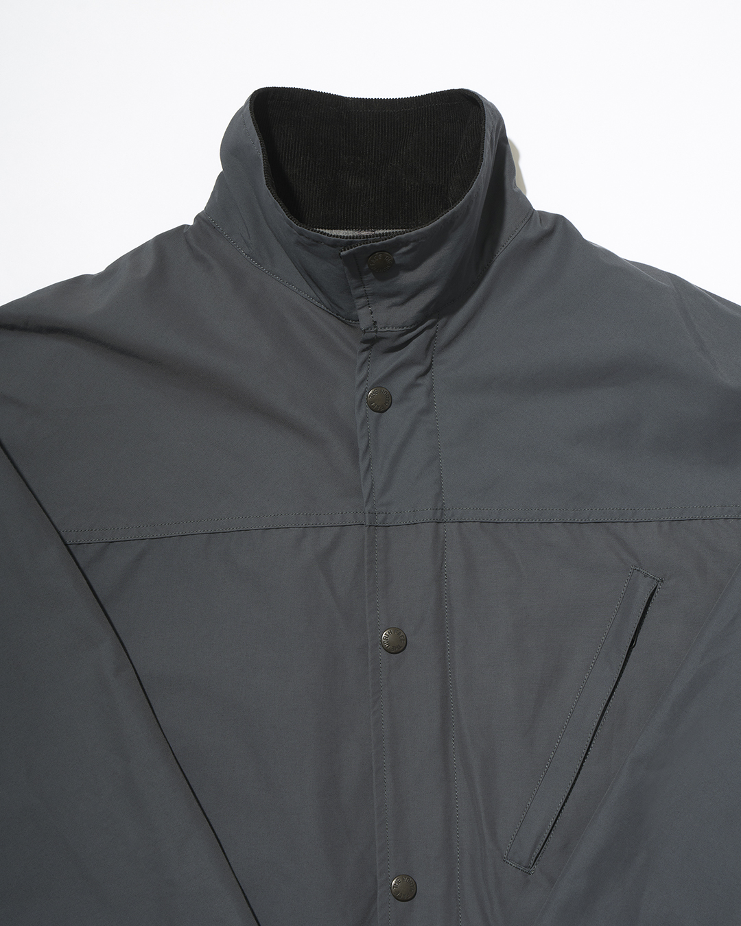ジャケットの顔を作る衿は、スタンドカラーとしても着用できる2Way仕様。内衿には70年代当時のヘビーデューティーなジャケットを意識して、コーデュロイ生地を採用しています。オーガニックコットンとリサイクルポリエステルのコーデュロイ生地は肌当りもソフトで、寝かせても立ててもサマになります。
