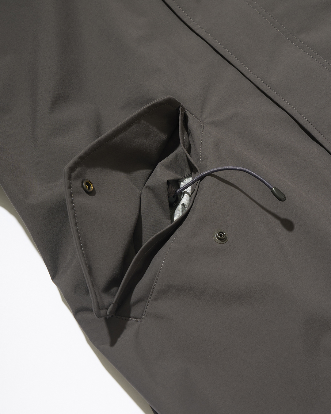 Since waterproof performance is essential in garments made with GORE-TEX fabric, subtle design adjustments have been made—like slightly shifting the shoulder seam toward the back to minimize exposure and improve protection.