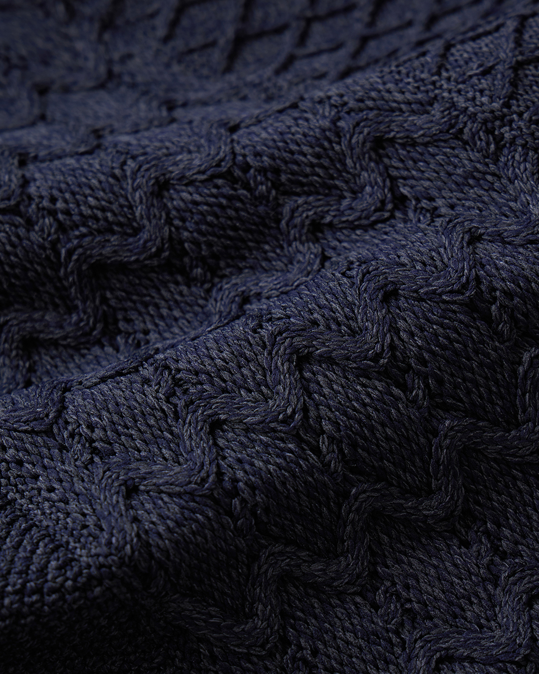 The design is based on what’s commonly known as a “fisherman sweater” or “Aran sweater.” Originating in the Aran Islands off Ireland’s west coast, these sweaters were traditionally hand-knit by women for their husbands and families heading out to sea. Each distinctive pattern carried a wish — for safe return, for a bountiful catch — and the motifs were passed down from generation to generation, differing from one household to another. Much like a family crest, these inherited designs are a key part of the sweater’s enduring appeal.