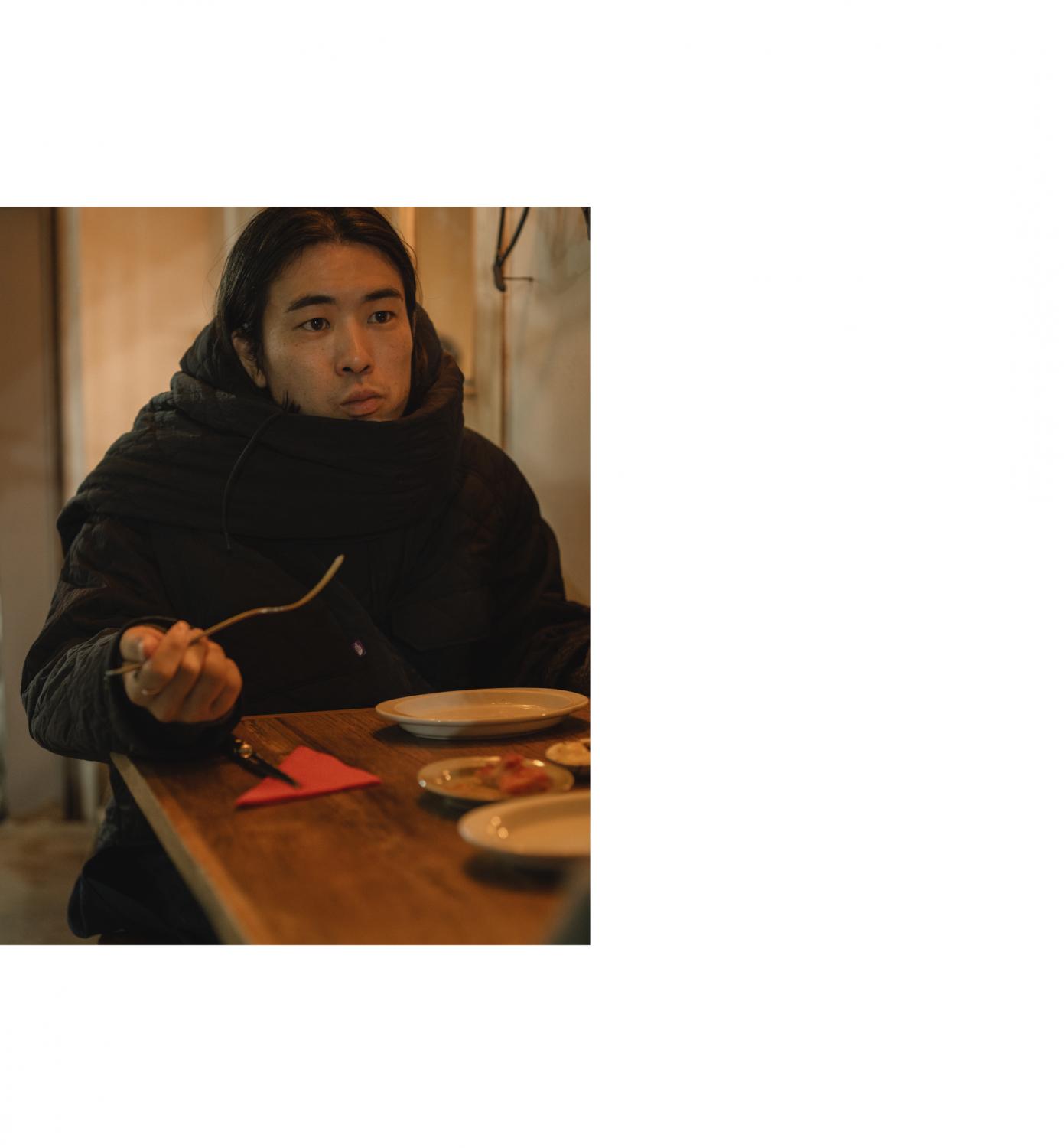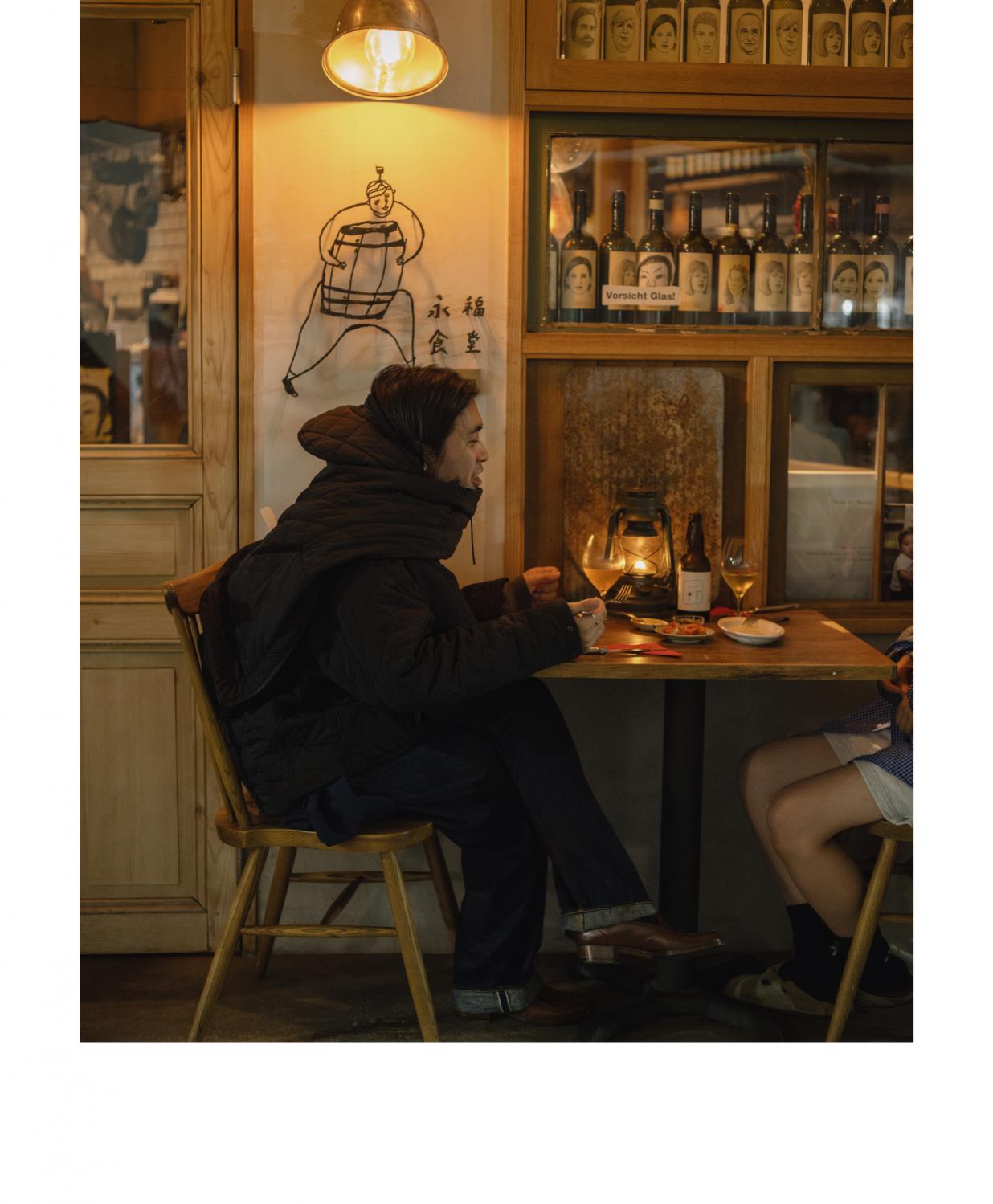 For editor Takuro, days fly by in a blur of interviews and exhibition visits. That’s why his days off are precious moments to let time flow at its own pace. His favorite spot, Eifuku Shokudo, offers natural wine and Italian dishes in a cozy setting that feels like a small European café. Even as the weather turns chilly, he likes to sit at his favorite terrace seat wearing the “Quilting Field Mountain Parka.” The cool breeze against his gently warmed, wine-flushed skin feels just right. The “Field Snood” doubles as a scarf, adding both warmth and versatility.