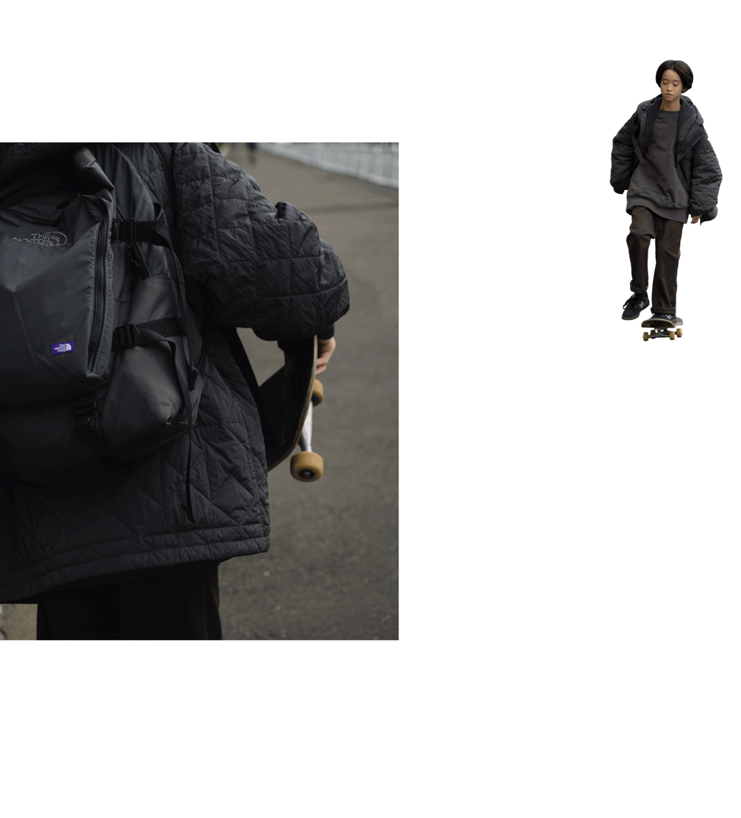Illustrator Okataoka, who is based in Kagoshima, made a quick trip to Tokyo to see his friend Yachiyo Katsuyama’s solo exhibition. No matter how far it is, he always finds time to visit friends’ shows and uses items they’ve created, like charms and handkerchiefs. It’s gestures like these that quietly reveal why he’s so loved by everyone around him. The cape-style “Quilting Field Mountain Cape” he’s wearing can become both an outer layer and a blanket, depending on how you use it. Though a large quilted cape might sound a bit intimidating, the asphalt gray — a classic color of THE NORTH FACE Purple Label — blends naturally into everyday wear. The original quilt stitching, inspired by American patchwork patterns, adds a charming touch.