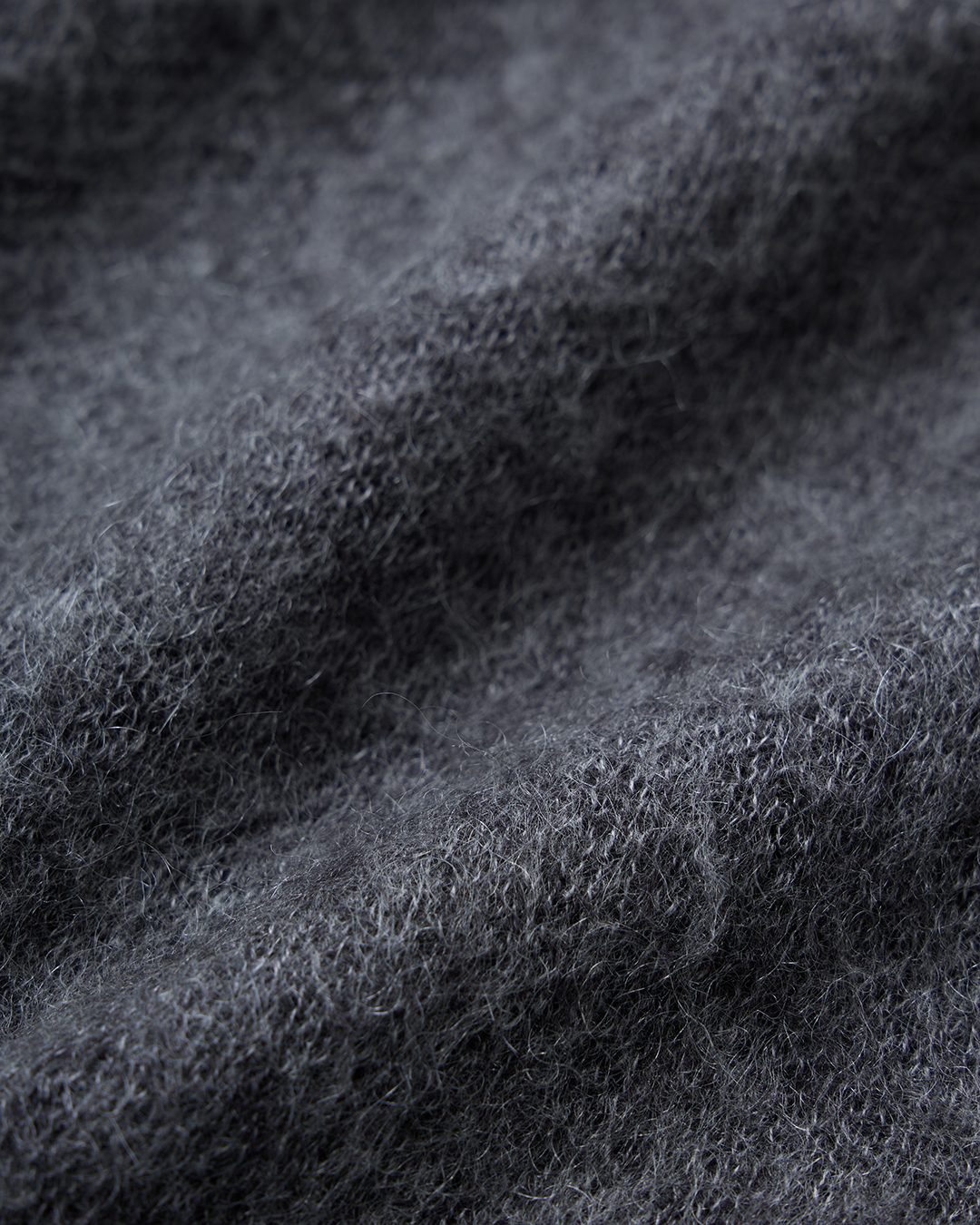 フリース特有のふっくらとした風合いを再現するために、起毛加工を施したキッドモヘヤ生地を採用。キッドモヘヤとは、生後1年未満のアンゴラヤギから刈り取られる繊維で、その繊細な毛質が生み出す柔らかさと上品な光沢が特徴だ。今シーズンから混紡率を見直し、さらなる軽量化を実現。しっかりとした温かさを保ちながらも薄手で、コートのインナーに合わせても着膨れせず、すっきりとしたシルエットをキープしてくれる。