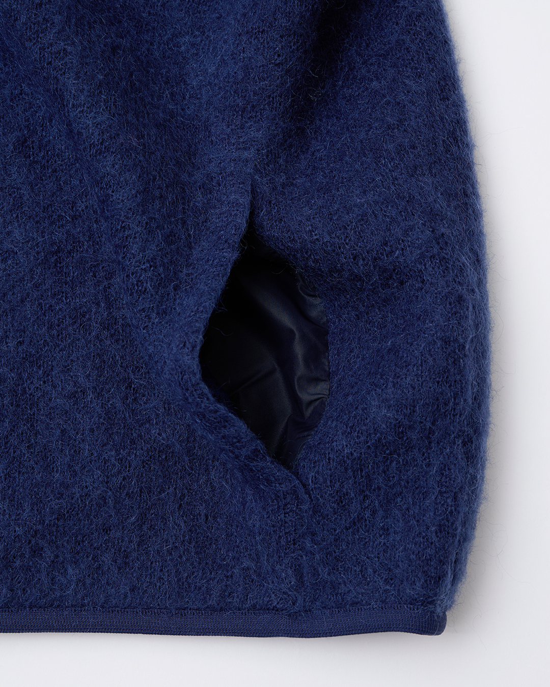 To recreate the soft, lofty texture characteristic of fleece, the sweater uses brushed kid mohair fabric. Kid mohair is fiber shorn from Angora goats less than a year old, known for its delicate texture, exceptional softness, and refined luster. This season, the blend ratio has been updated to make the fabric even lighter. It retains ample warmth while remaining thin enough to layer under a coat without adding bulk, maintaining a clean, streamlined silhouette.