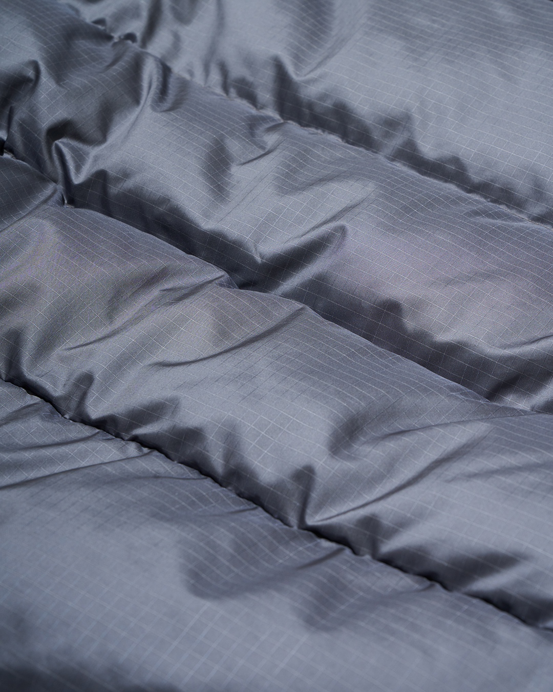 Like the Field Jacket and Hooded Coat, the down outerwear uses a two-layer ePE GORE-TEX fabric that combines a non-fluorinated waterproof, breathable membrane with a water-repellent finish. The outer material is a 70-denier recycled nylon poplin with a subdued matte texture, giving the piece a solid, urban look.