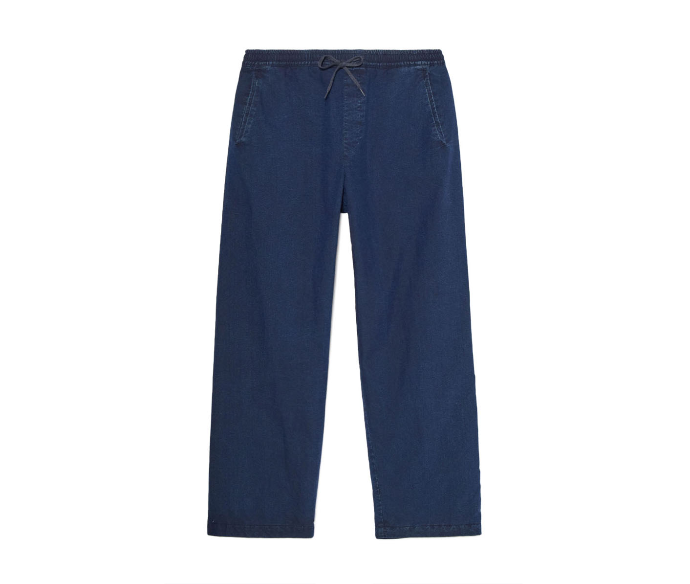 軽くて保温性に優れたPrimaLoft®中わたを使用した、インディゴ染めのコットンナイロン素材のパンツ。ワイドなシルエットに、サイドシームを排した構築的なデザインを採用。ウエストドローコードのついたシャーリング仕様。経年変化を楽しみながら長く着用できる素材感が魅力です。