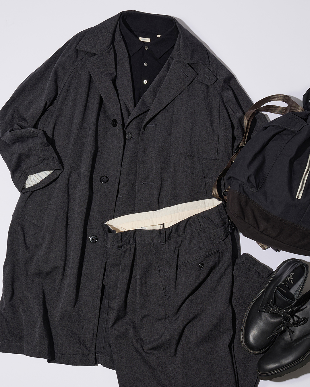 An all-black outfit of coats and tailored sets can sometimes feel heavy — but choosing a textured black chambray, known as “goma-shio” for its subtle mottled finish, brings both lightness and depth to the look.