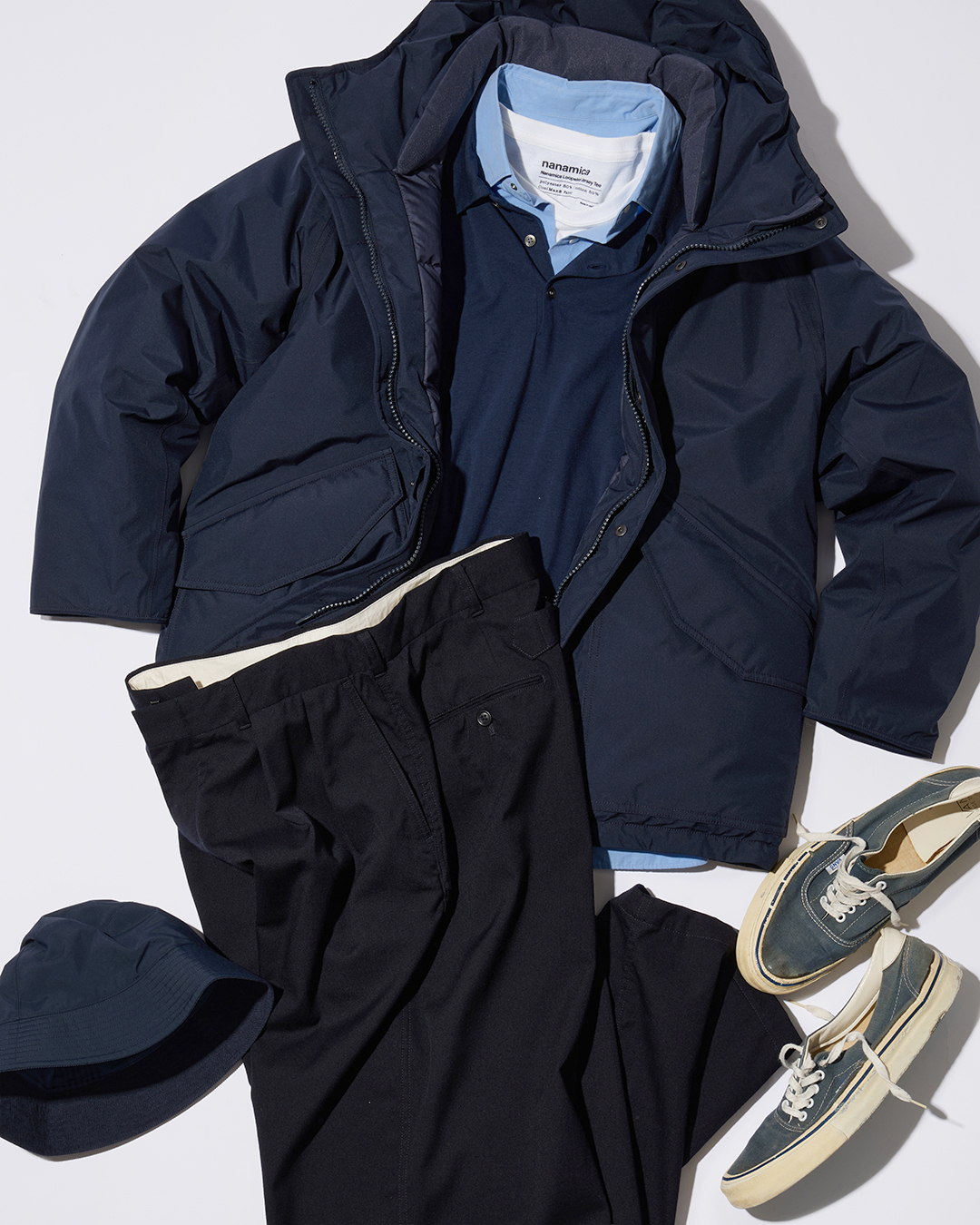 Wool gabardine pants blend seamlessly into both sharply tailored setups and casual looks centered around a down jacket. The mottled charcoal gray offers a relaxed contrast to the dark navy, with its deep, layered hue that anchors Nanamica’s signature navy-toned styling.