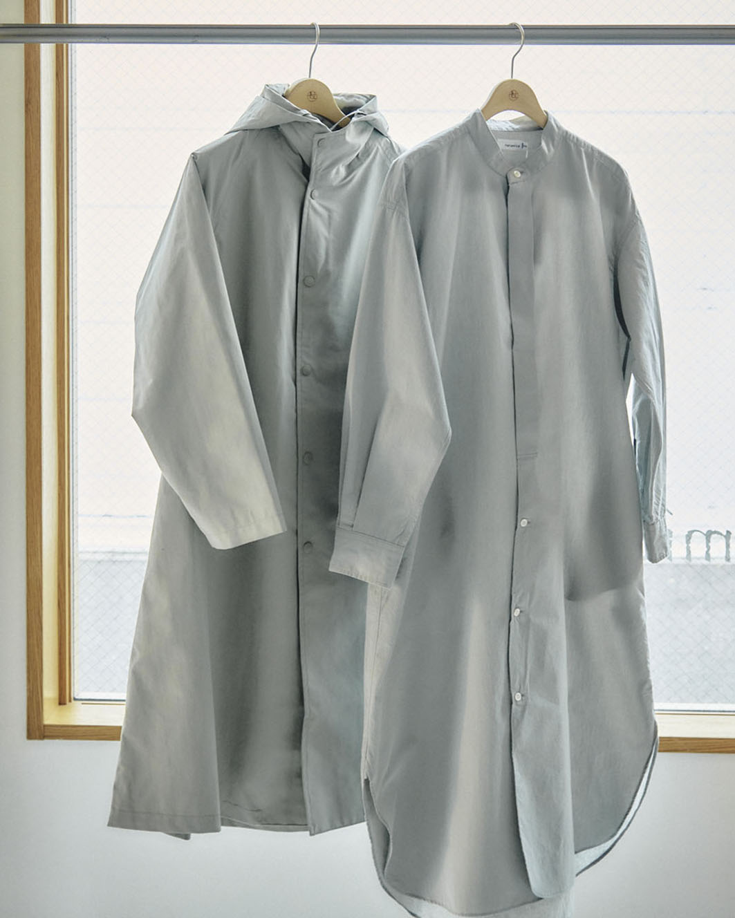 まずは、今の時期にはコートのインナーとして、春にはメインアウターとして活躍する新作のご紹介から。ついダークトーンにまとめがちなこの季節に、軽快なムードを添えてくれるのが、リサイクルナイロンツイルを採用したフーデッドジャケットです。中割れ仕様のフードは、ジッパーを開けることでセーラー襟のような表情へと変化。ナイロン素材でありながら、まるでコットンのような自然な風合いと、しっとり滑らかな質感を備えているため、冬から春へと移ろう時期のスタイリングにもすっと馴染んでくれます。さらにフード裏にあしらわれたコットンシルクネップが、さりげないアクセントに。
