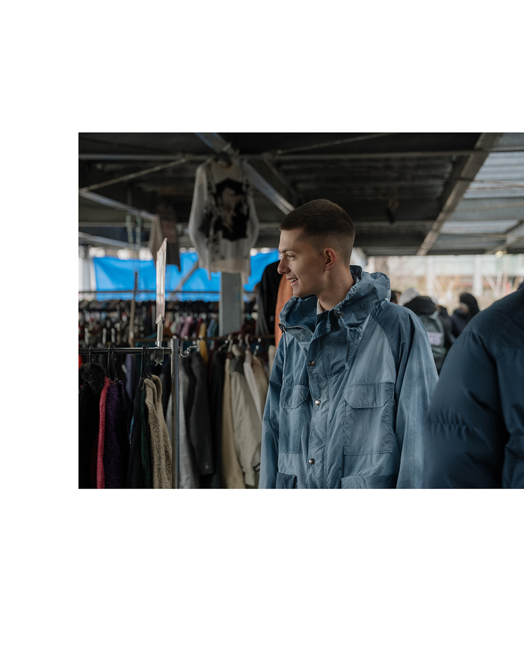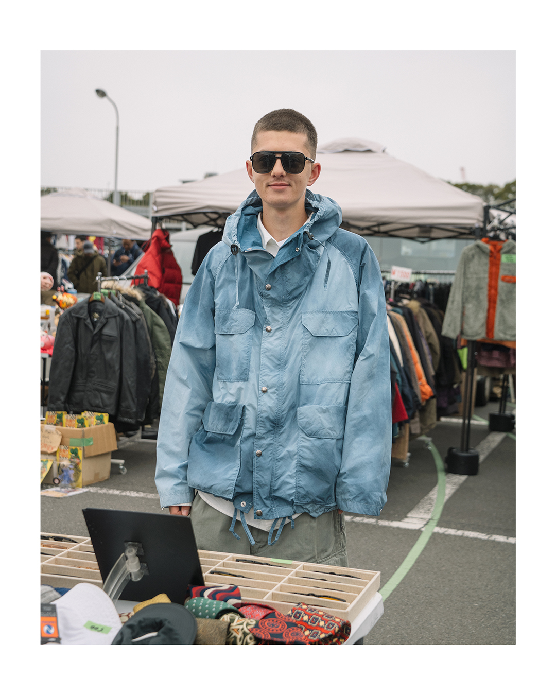 As you can see, this mountain parka feels a little different from the usual. The color is a sax blue with depth, created through an uneven dyeing process. It looks like a hazy blue sky — irresistibly charming. The impression changes depending on how the light hits it, and I find myself stopping in front of the mirror again and again. But that’s not the only thing that sets it apart from the standard 65/35 Mountain Parka. The surface of the recycled nylon taffeta fabric has an ultra-fine brushed finish, invisible to the eye, which gives it a soft texture. Even a few wrinkles add character, so it’s easy to throw on without overthinking it.
