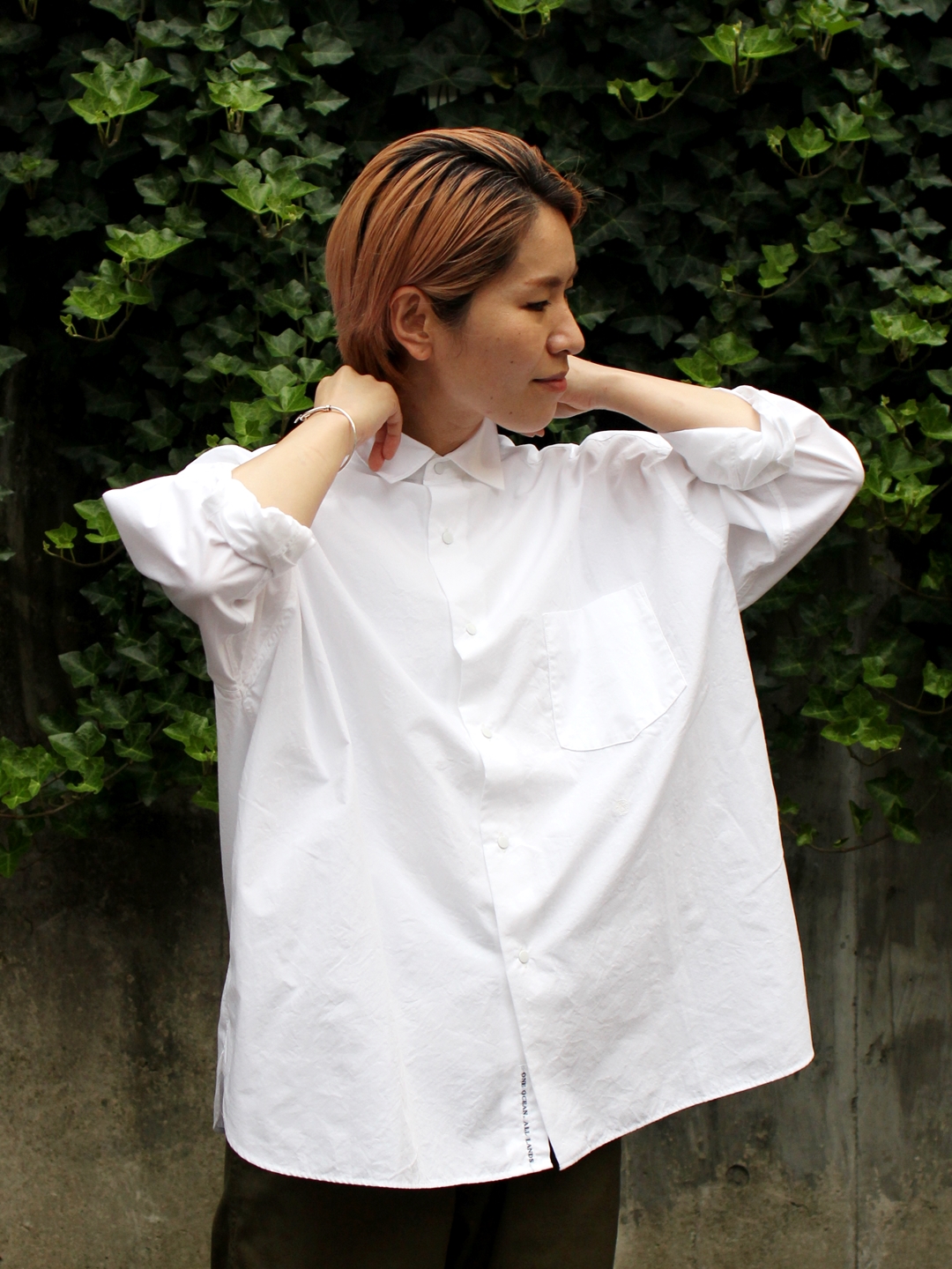 見た目はコットン素材のようでいて、ポリエステルの持つ軽さやハリ感も気持ちが良い白シャツ。