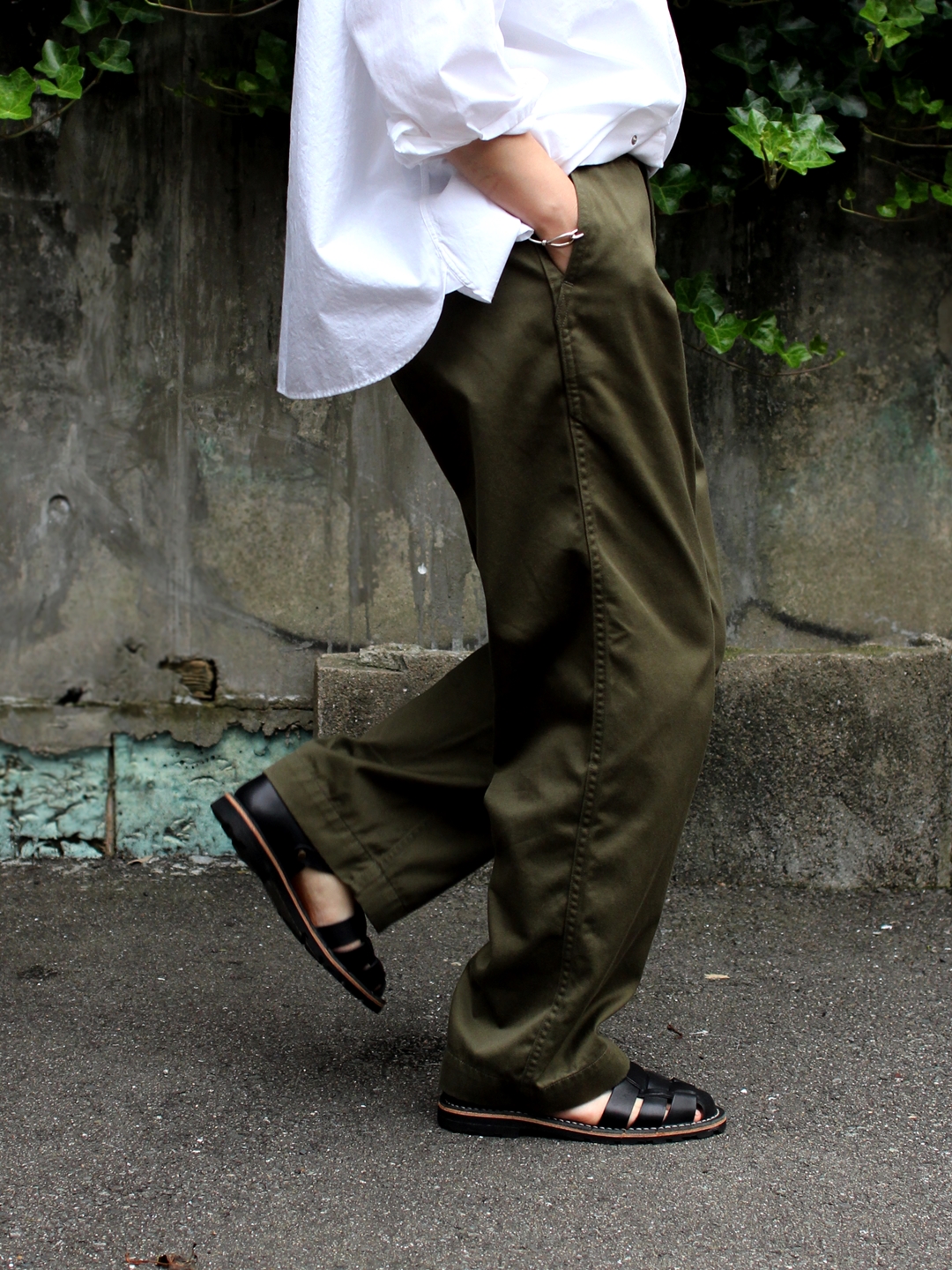チノパンは、今シーズンの新色のオリーブで少しだけミリタリー感を。